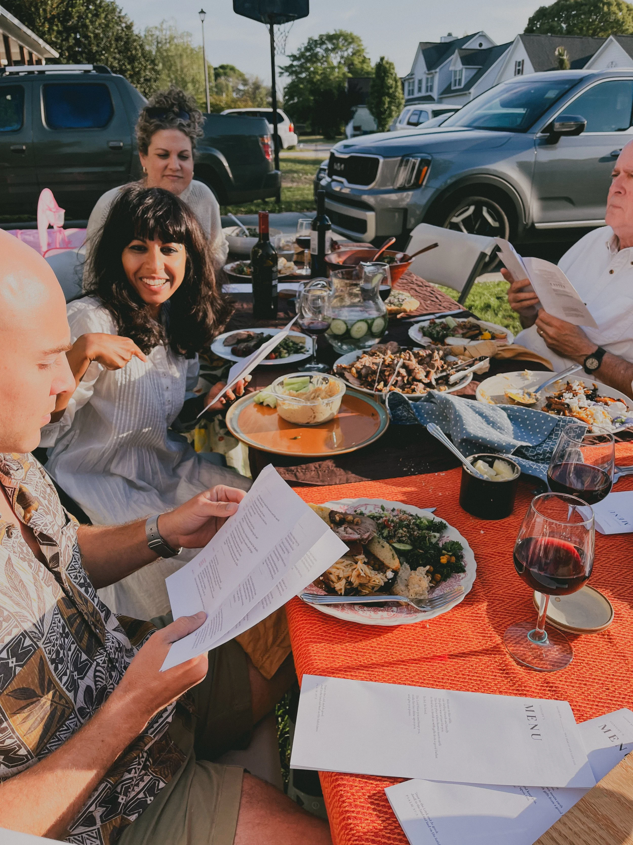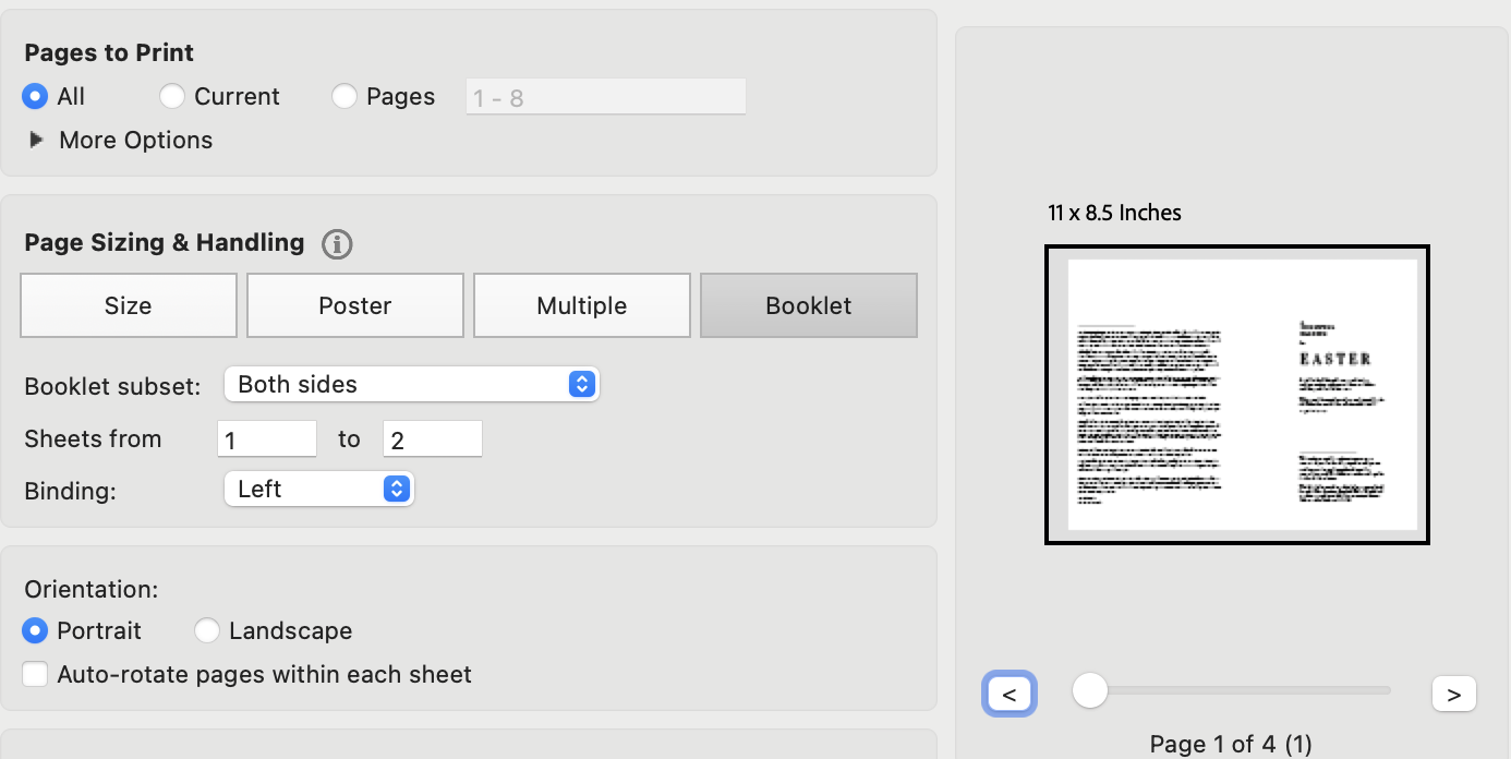 The finished/folded size of this document is half-letter size (approx A5). If you use the standard booklet setting for your home printer, it should print double-sided on two letter sized sheets (approx A4). You can then fold both sheets together it in half for a little table place booklet.