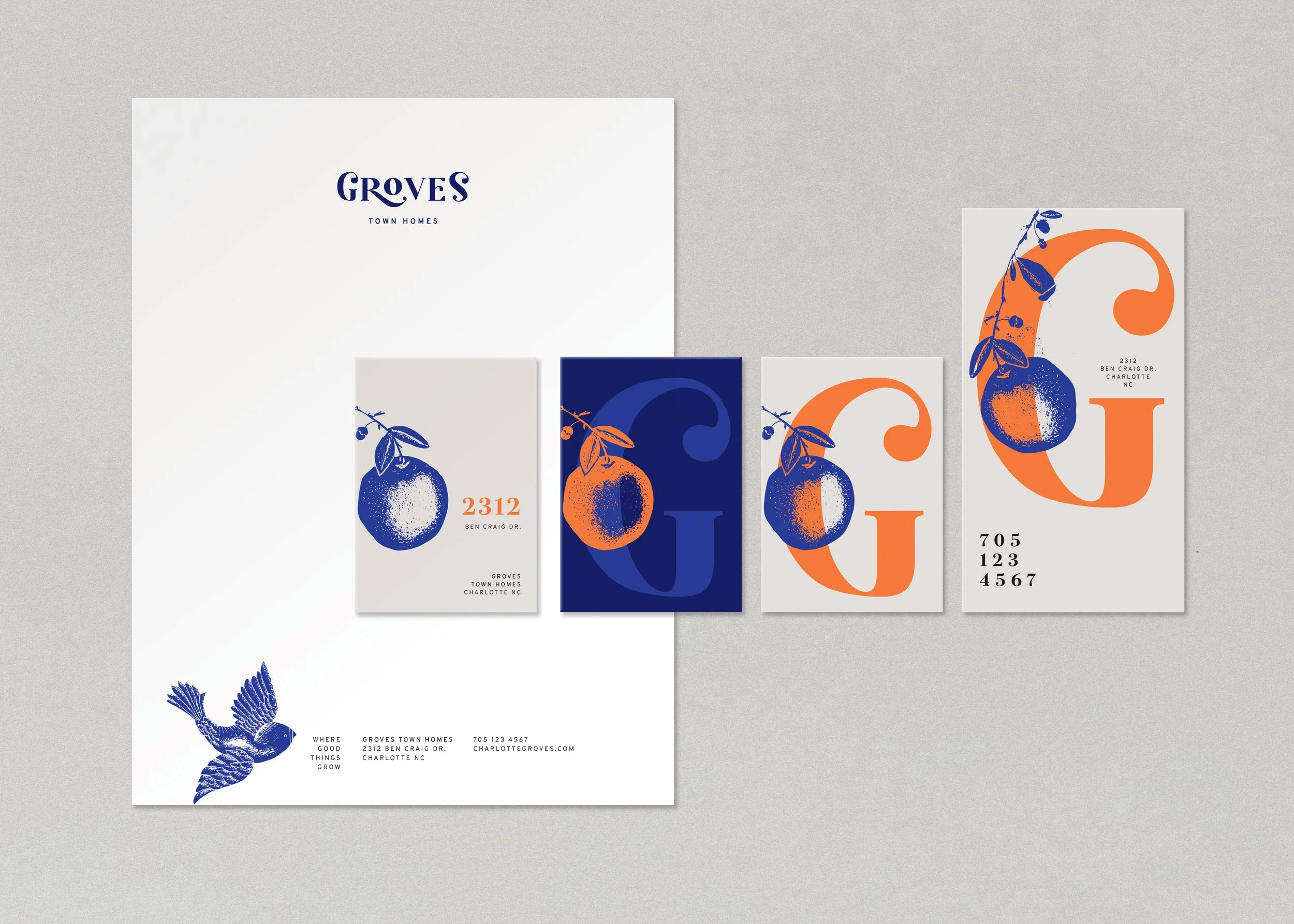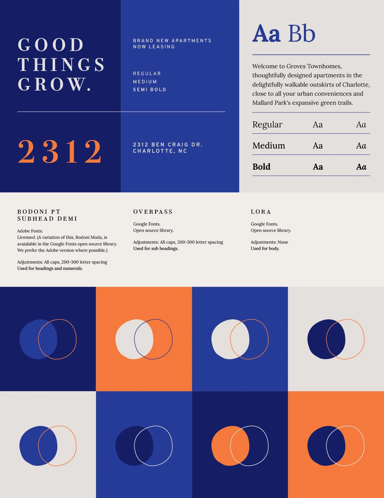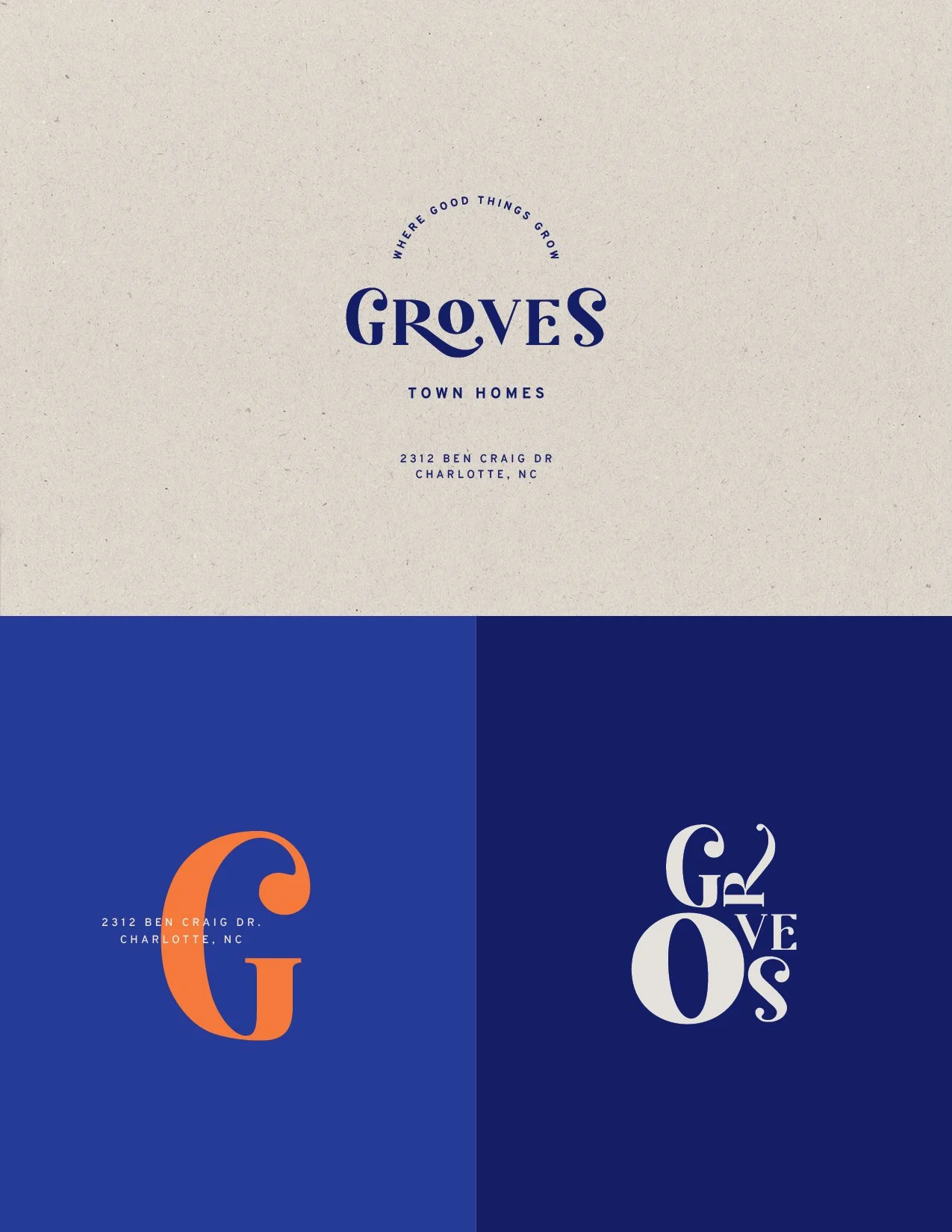 I chose a bold color palette that would work well with interiors as well as printed and digital branding. The palette is intentionally not green or earthy (as one might stereotypically expect for a brand called Groves). It’s vibrant. Daring. Unexpected in the industry of middle-class rental residences. It demands your attention, captures your imagination. An edgy sort of luxury. Not the “money can buy” sort, but something more avant-garde, for anyone who can appreciate tasteful, thoughtful design - and make it their own.